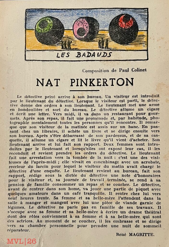 Magritte en Pinkerton zijn complementair, de klassieke detective onthult de waarheid en Magritte toont dat er misschien geen definitieve waarheid is. Het detective-thema geeft een unieke inkijk om zijn surrealistische wereld te begrijpen. Magritte groeide op met detectiveverhalen en sensatiekranten. Deze thema’s nam hij mee in zijn kunst in de vorm van maskers en vermommingen, identiteiten en verborgen lagen, spanning tussen wat getoond wordt en wat verborgen blijft. Voorbeelden in zijn werk zijn mannen met bolhoeden, gezichten achter doeken, ramen die bedriegen en objecten die niet zijn wat ze lijken.